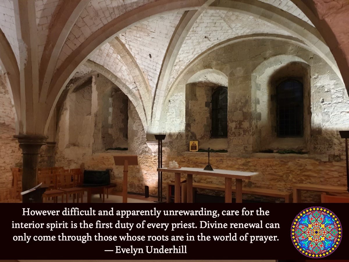 I desire very humbly to suggest with bishops assembled at Lambeth that the greatest and most necessary work they could do at the present time for the spiritual renewal of the Anglican Church would be to call the clergy as a whole, solemnly and insistently to a greater interiority and cultivation of the personal life of prayer. This was the original aim of the founders of the Jerusalem Chamber Fellowship, of whom I am one. We were convinced that the real failures, difficulties and weaknesses of the Church are spiritual and can only be remedied by spiritual effort and sacrifice, and that her deepest need is a renewal, first in the clergy and through them in the laity; of the great Christian tradition of the inner life. The Church wants not more consecrated philanthropists, but a disciplined priesthood of theocentric souls who shall be tools and channels of the Spirit of God: and this she cannot have until Communion with God is recognized as the first duty of the priest. But under modern conditions this is so difficult that unless our fathers in God solemnly require it of us, the necessary efforts and readjustments will not be made. With the development of that which is now called “The Way of Renewal” more and more emphasis has been placed on the nurture and improvement of the intellect, less and less, on that of the soul. I do not underrate the importance of the intellectual side of religion. But all who do personal religious work know that the real hunger among the laity is not for halting attempts to reconcile theology and physical science, but for the deep things of the Spirit.