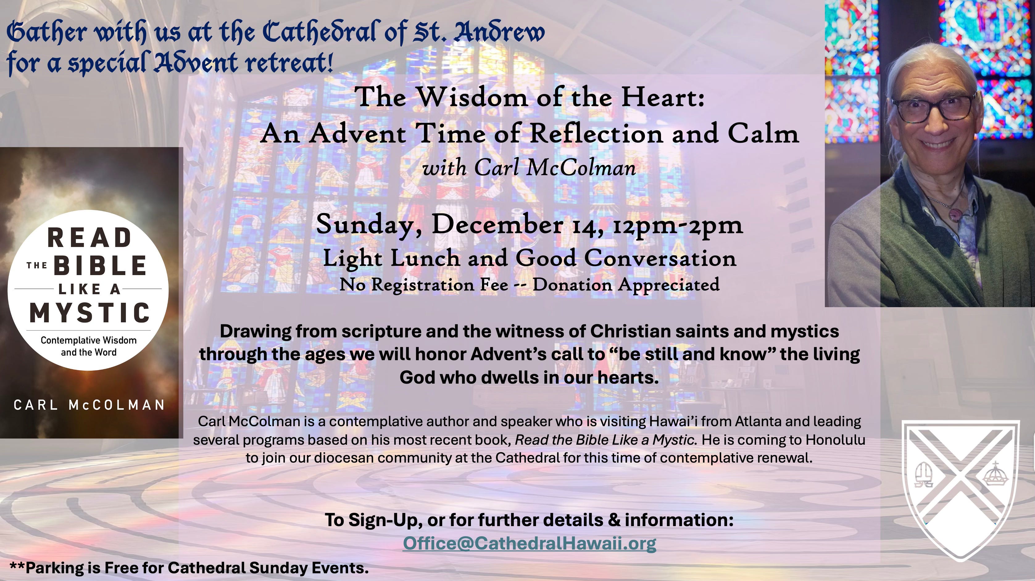 For the third Sunday in Advent, Gaudete Sunday, I’m heading over to the Island of Oahu to visit the Episcopal Cathedral of St. Andrew in Honolulu. We’ll gather at noon on December 14 for a light lunch and conversation on the Advent theme of “the Wisdom of the Heart,” drawing not only on Read the Bible Like a Mystic but also Eternal Heart. Program runs from noon to 2 PM; there is no charge although donations to help defray costs will be gratefully received. All are welcome. For more information or to register, please email the cathedral office at Office@CathedralHawaii.org.