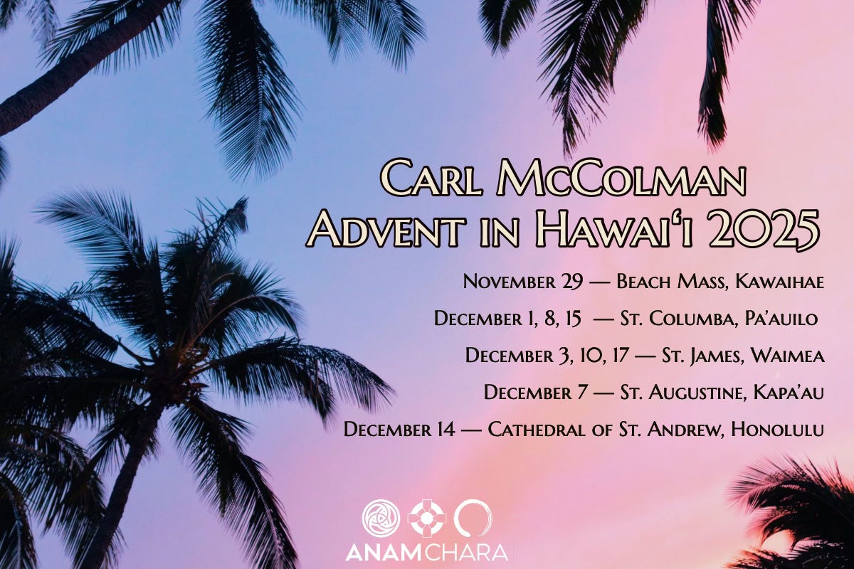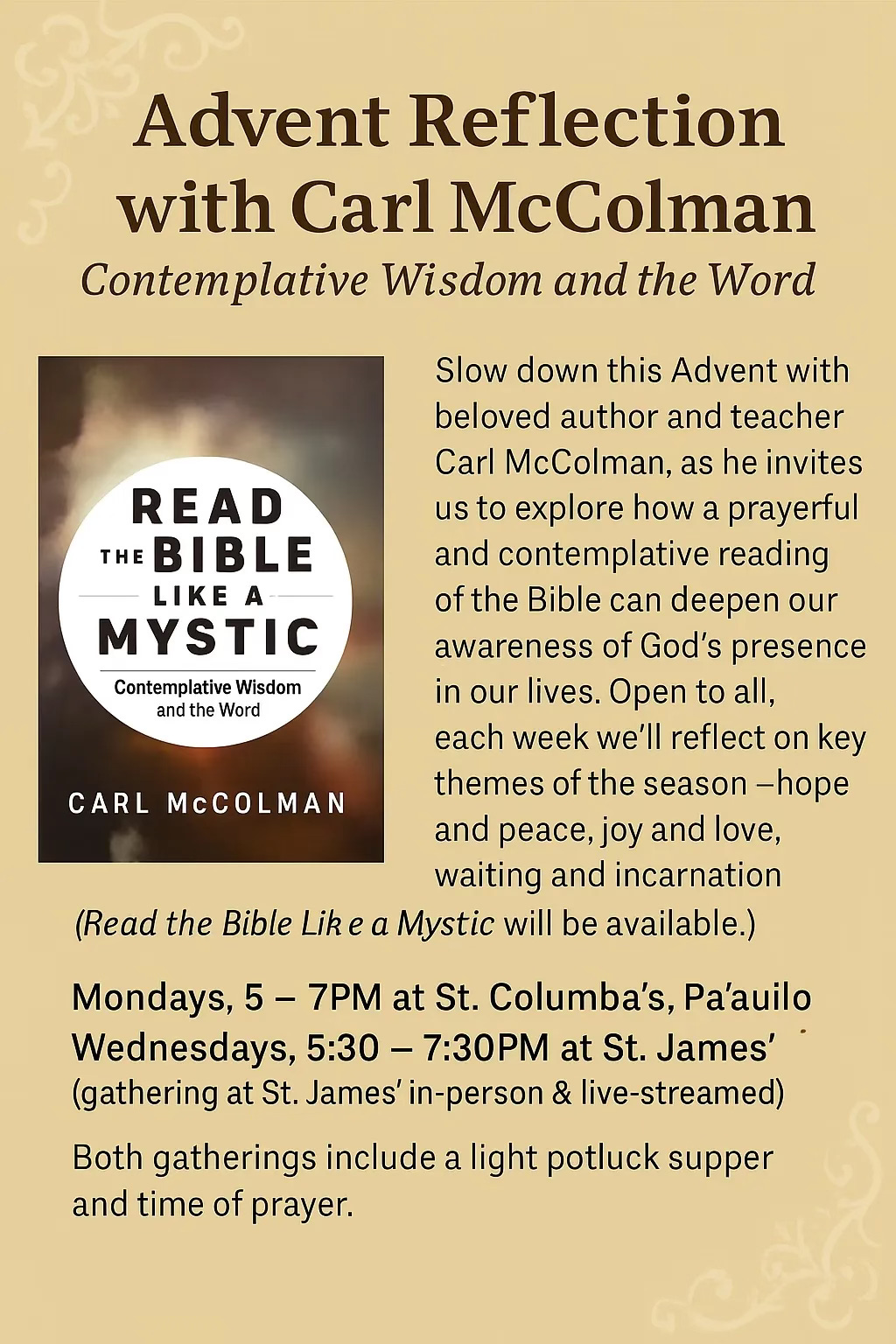 I’m presenting advent programs at two different churches: on Mondays (December 1, 8, and 15) I’ll be at St. Columba’s Episcopal Church in Pa’auilo; and on Wednesdays I’ll be back at St. James in Waimea. It will be the same program both nights: “Contemplative Wisdom and the Word,” drawing from my book Read the Bible Like a Mystic but with a special eye to the rhythm of contemplative waiting and gentle rest that forms the character of the Advent season. The Wednesday night presentations will be live-streamed, so if you are not on the big island, you can still join in. Visit www.stjameshawaii.org for more information.
