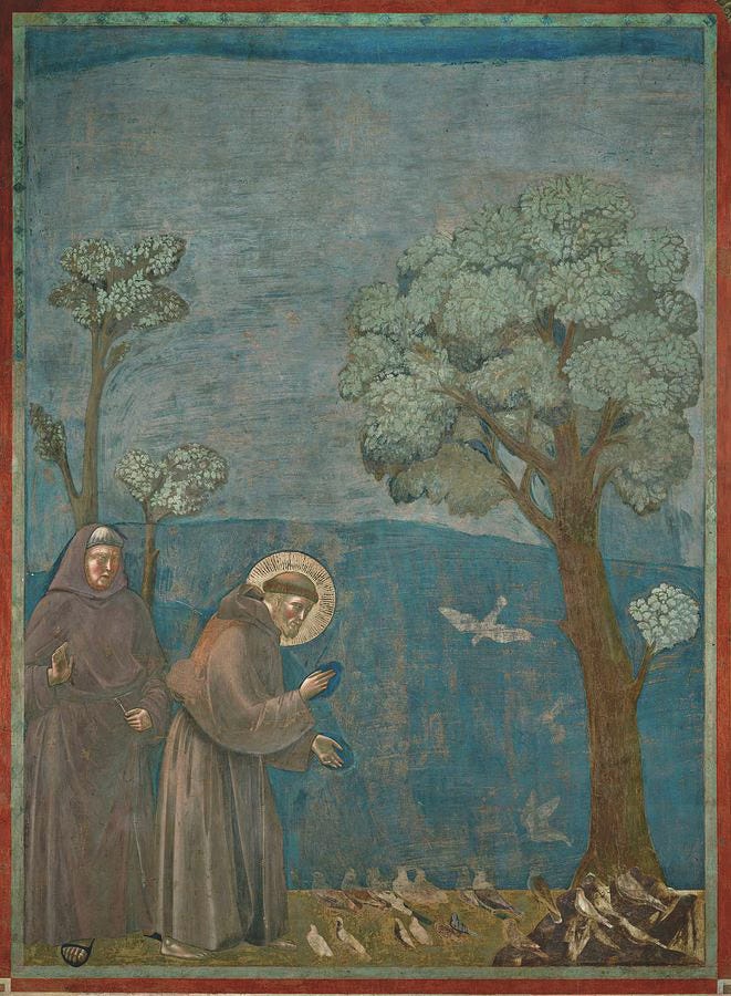 Deeply elemental and imbued with a sense of wonder and devotion at the many blessings of the natural world, it would not take much editing to turn this into a hymn of praise that a coven of Wiccans could use in one of their circles — but when you consult the Canticle in its entirety you’ll find references to mortal sin, humility, and doing God’s will: the kind of language that conservatives typically are more likely to affirm and use. So yet again, the hippie is also a saint, the one who loved birds and wolves also the inspiration for the Argentinian Jesuit cardinal Jorge Bergoglio, who (thanks to his devotion to caring for the poor) took the name Francis when he was elected pope in 2013. Pope Francis may have been the first pontiff bold enough to take the name of Il Poverello (the “poor man”), but I suspect he won’t be the last.