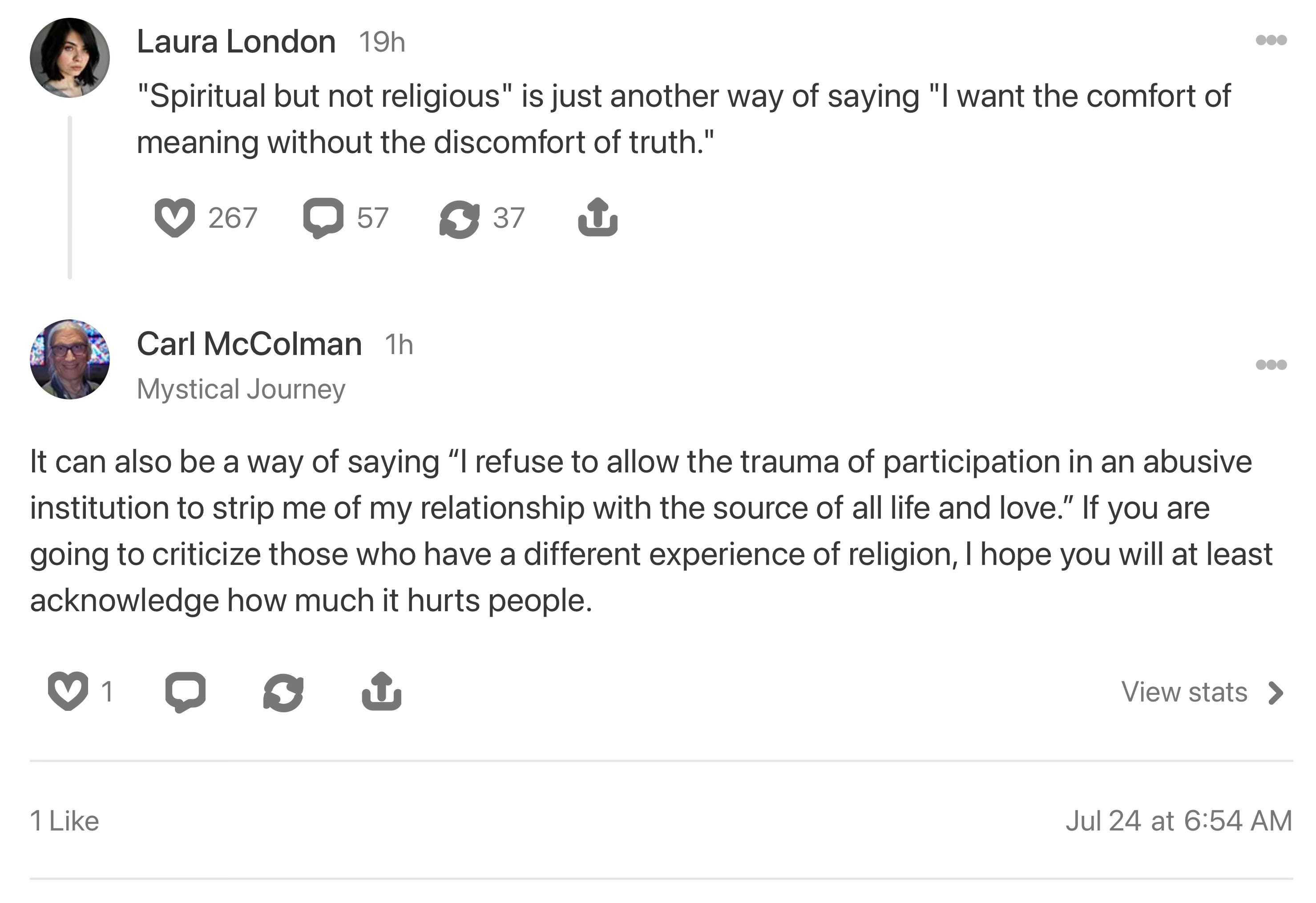 While I doubt that anything could be gained by getting into a debate over this — Laura London is certainly entitled to her view — it seems worthwhile to write a bit more about why I believe it’s a mistake to chide people who walk away from religious institutions, especially if they retain at least some understanding of themselves as “spiritual.”
