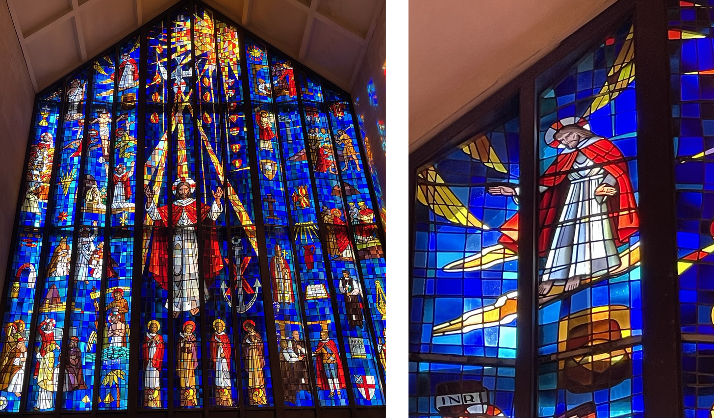 There are online commentaries on this window that suggest Jesus was depicted this way as a uniquely Hawaiian way of envisioning the miracle of walking on water. I think that’s charming, and perhaps is a helpful way of framing this image for anyone who might find it scandalous. But I’d like to suggest that we could also simply accept it for what it is: an image of the Christ that is meant to make him relatable to the people of that part of the world. Surfing, after all, is a practice that — as a sport — originated in Polynesia, and it remains deeply embedded in both traditional and contemporary Hawaiian culture. If Jesus really wanted to meet the people of Hawaii on their own turf (or should I say, on their own surf), wouldn’t he come to them riding a surfboard?